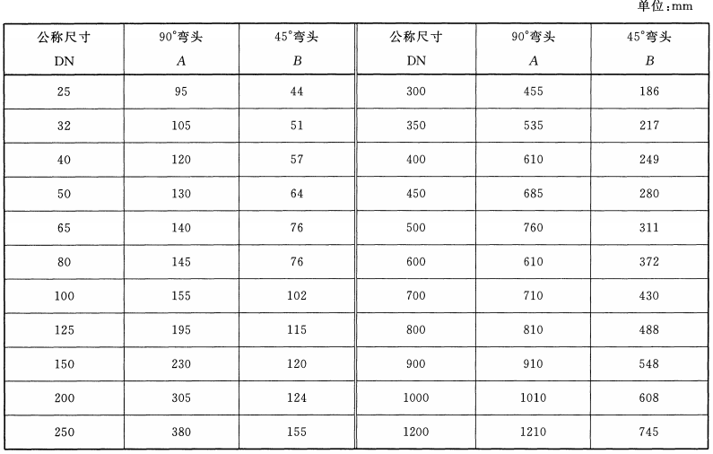 襯塑彎頭管件詳細尺寸表: